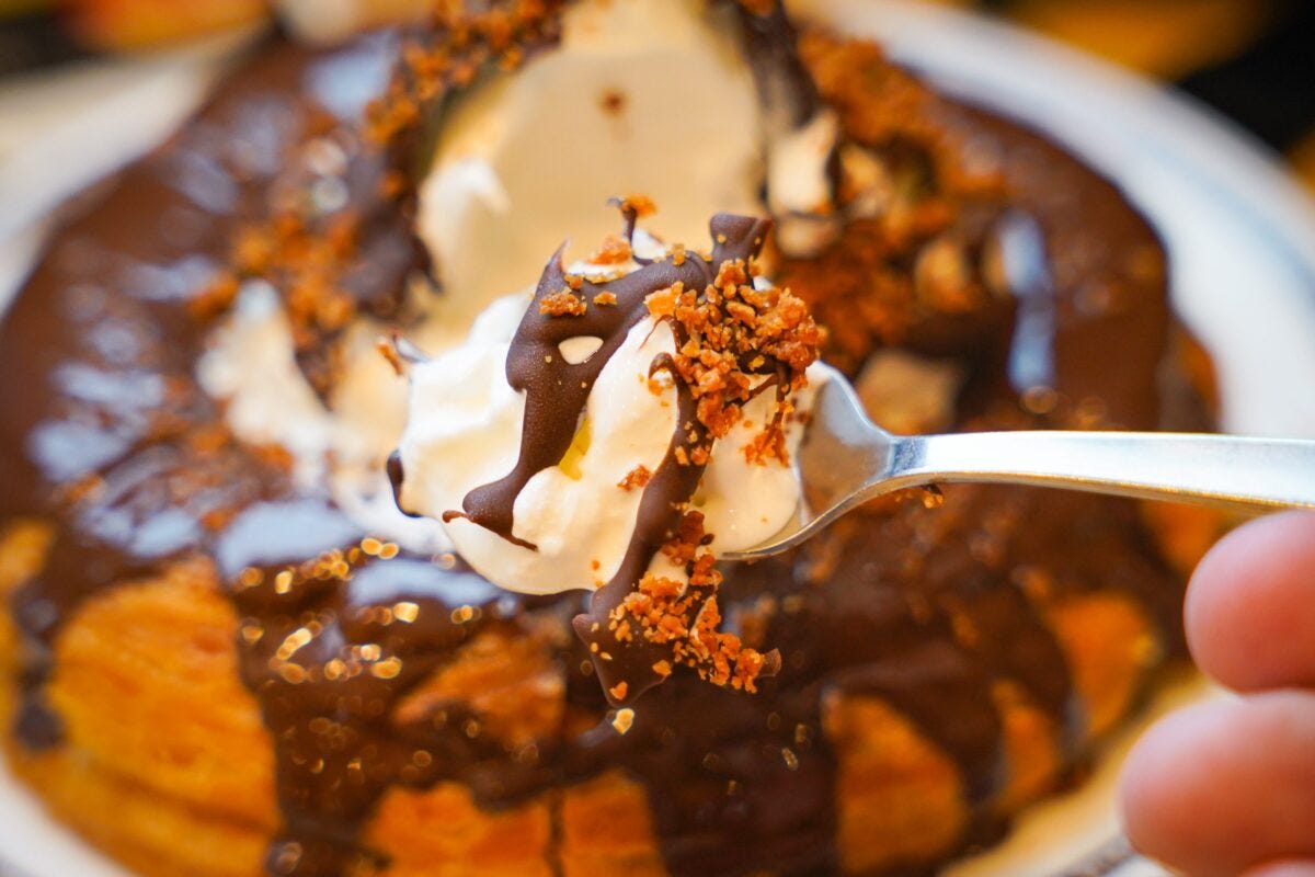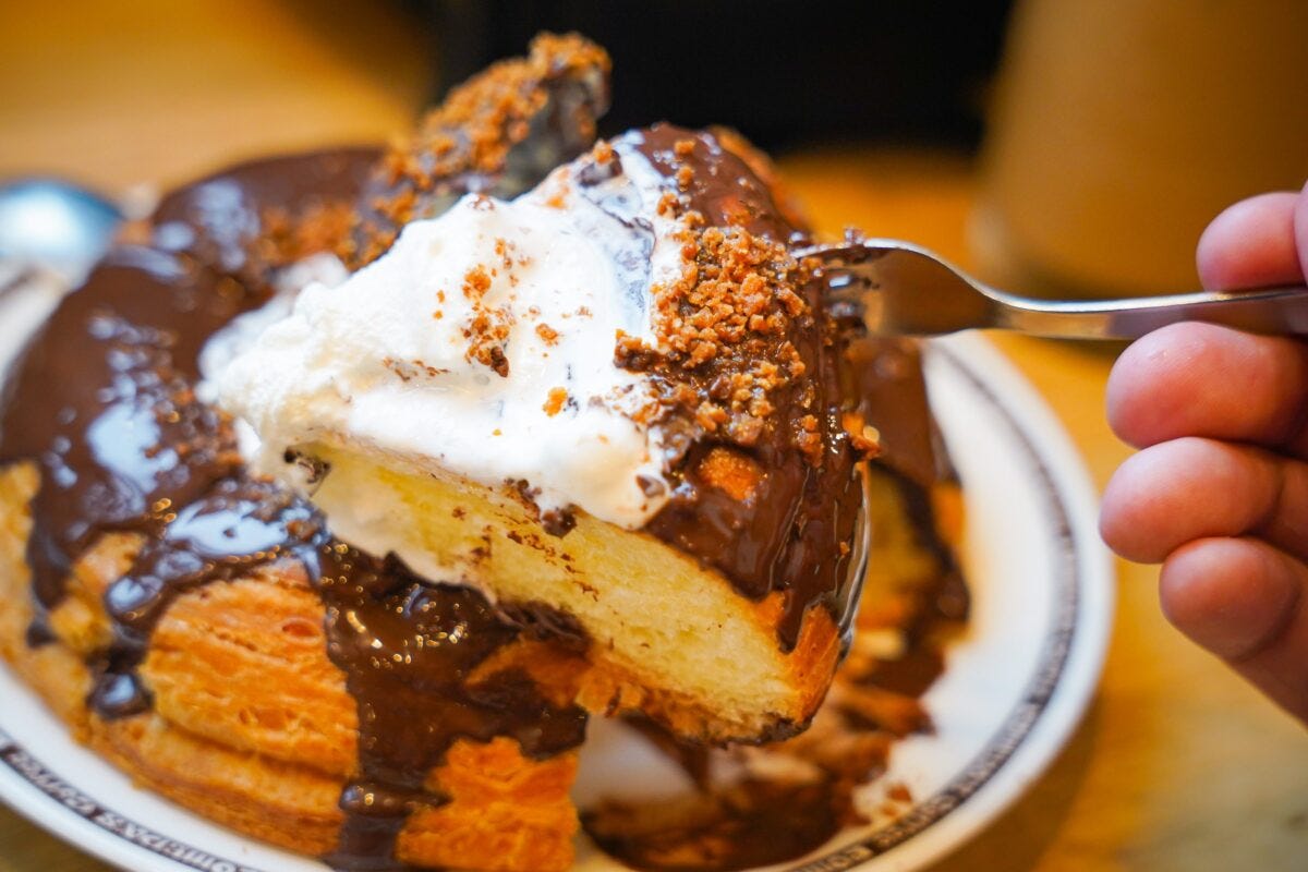 続けてほかほかのデニッシも一口。もちろん激ウマ!! 64層のふっくらとしたデニッシュにアイスが染み込み、それらをチョコレートのコク深い風味が包み込む。
