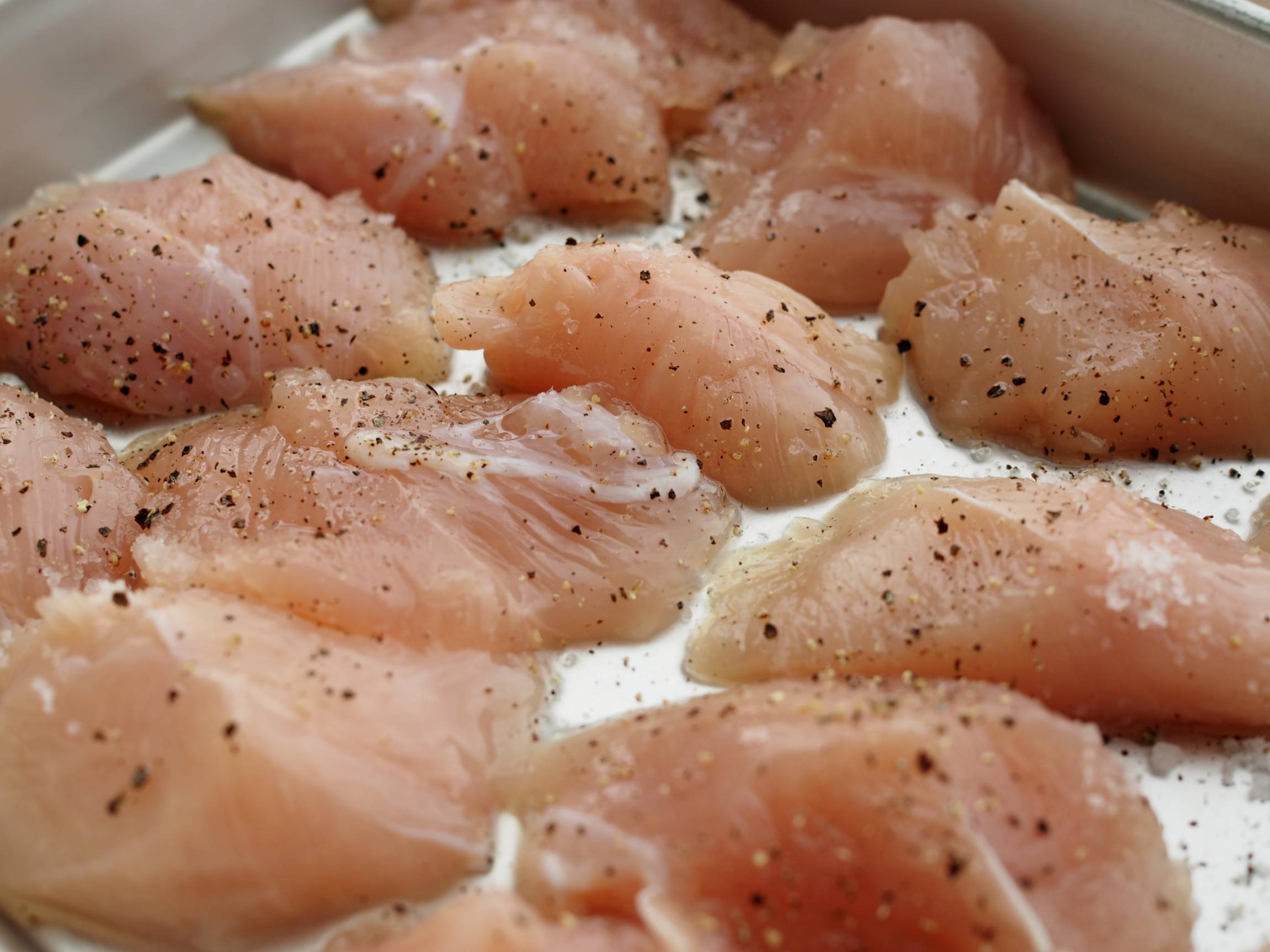 切った鶏ささみをバットに入れ、塩と粗挽き黒こしょう、酒をまんべんなくかけたら5分ほど置きます。