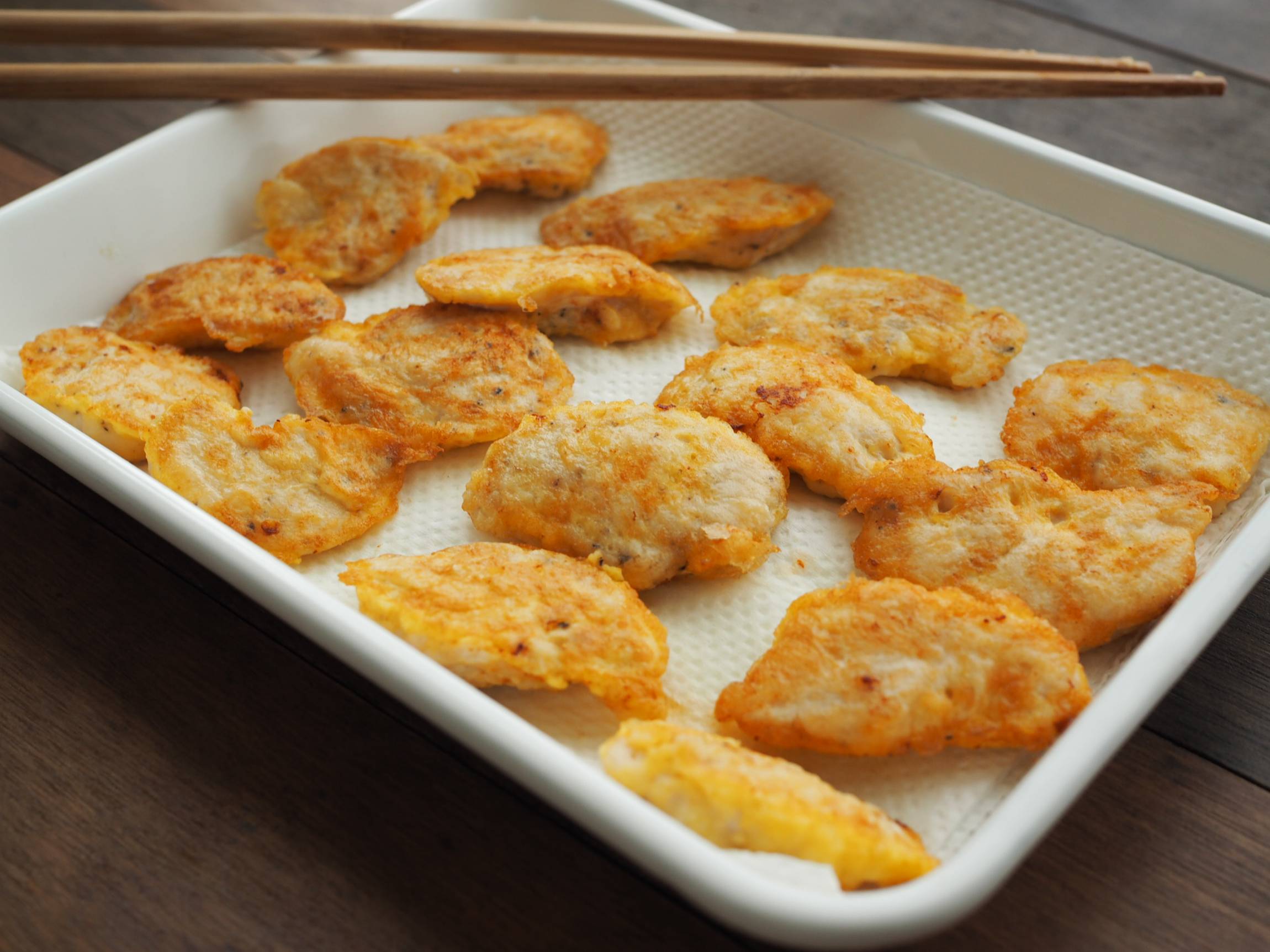鶏ささみに卵液を絡める