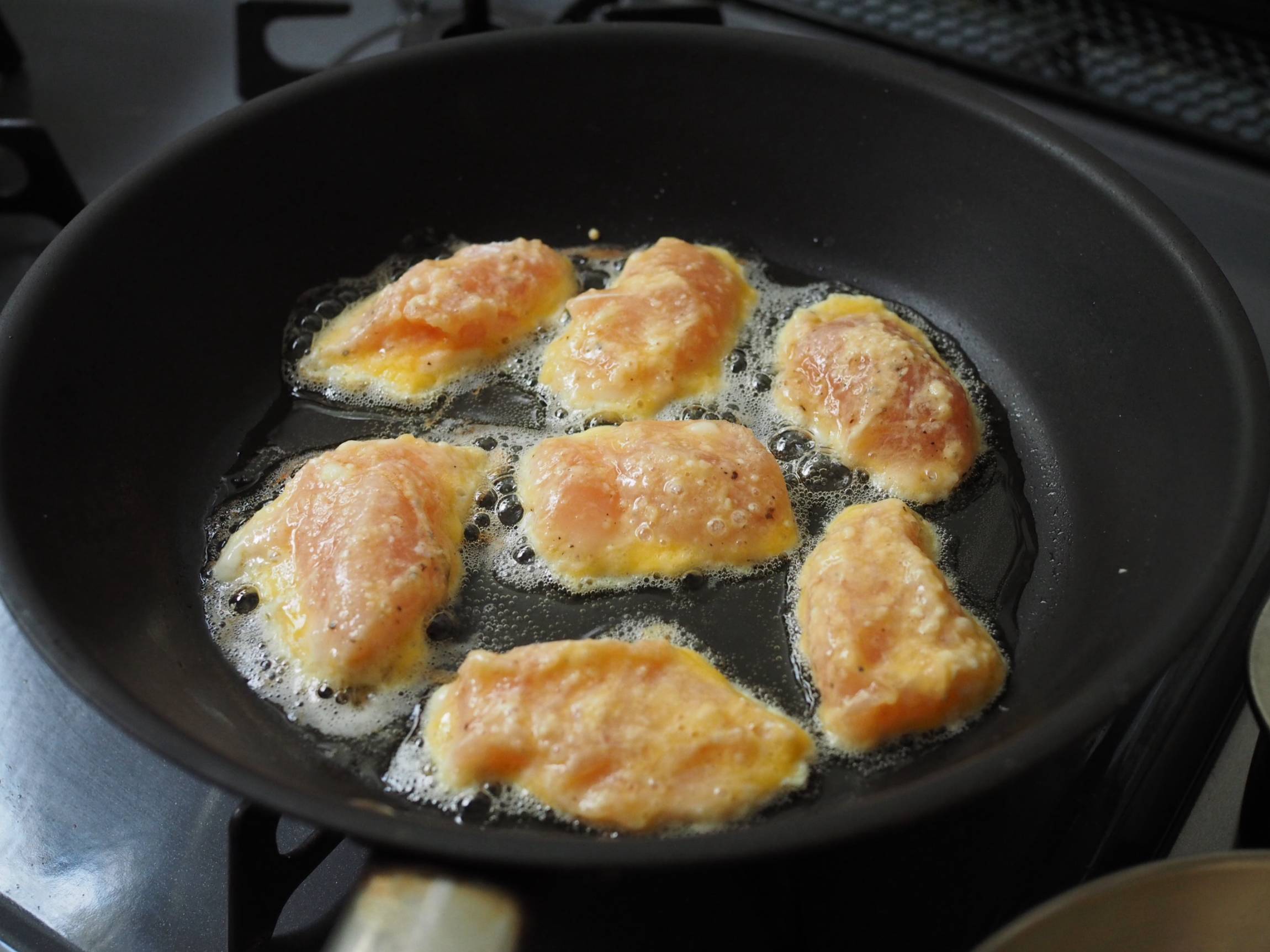 フライパン全体に広がるようにサラダ油を入れ、中火で熱したら、卵液をつけた鶏ささみを入れ、すぐ弱火にします。