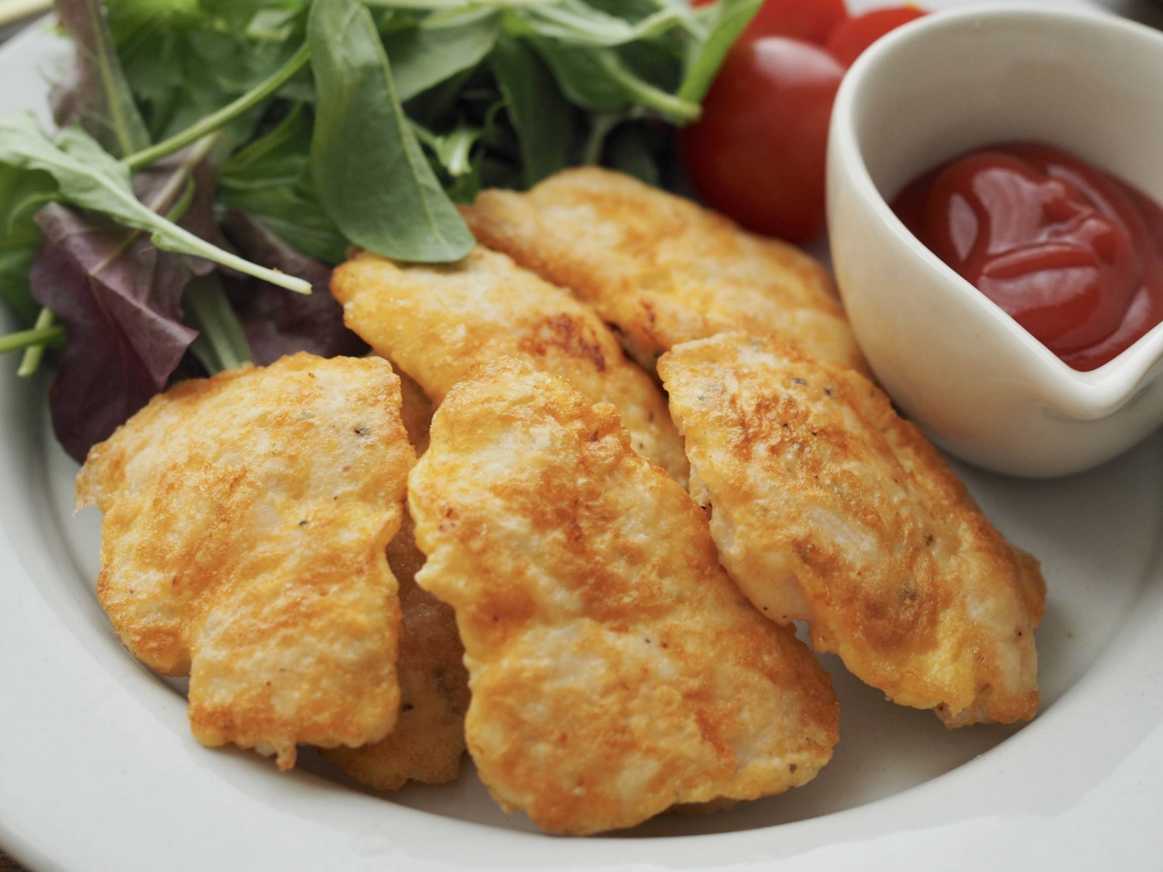 皿にリーフとトマト、鶏ささみのピカタを盛ったらできあがり。お好みでケチャップやオーロラソースを添えてください。