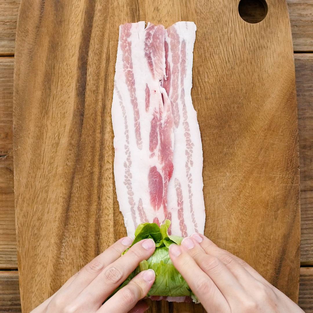豚バラ肉を少し重ねるように並べます。レタスを折りたたんで巻いたら、豚肉にのせて巻き上げます。