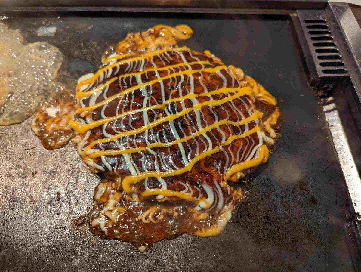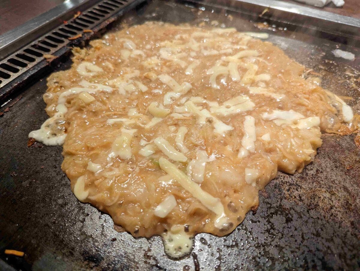お好み焼きで注文した「究極チーズ玉」は、見た目はチーズソースがかかったお好み焼きで、究極と言うにはやや地味なのだが、ひと口食べれば何が究極なのかはすぐにわかった。