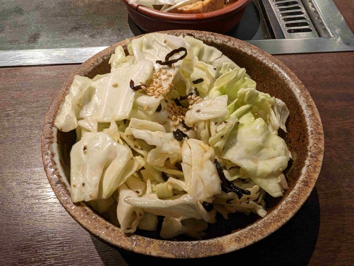 塩昆布キャベツも塩昆布の旨味と塩味がハッキリわかる味付けで食欲が上がる。お酒のお供にもピッタリだ。
