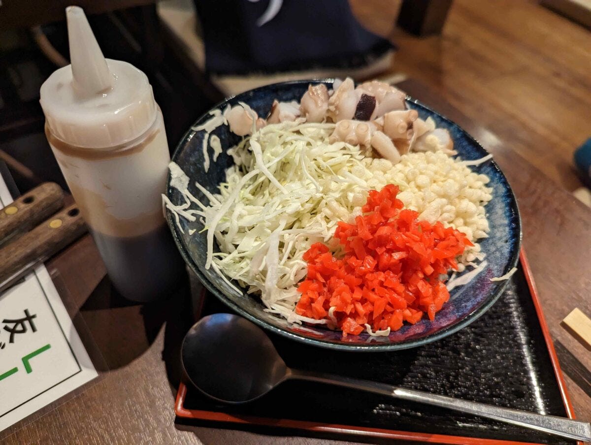 メインのもんじゃでまず注文したのは、お店オススメの「たこ焼きもんじゃ」。880円と千円を切る価格ながら、たこがふんだんに入っているのが嬉しい。