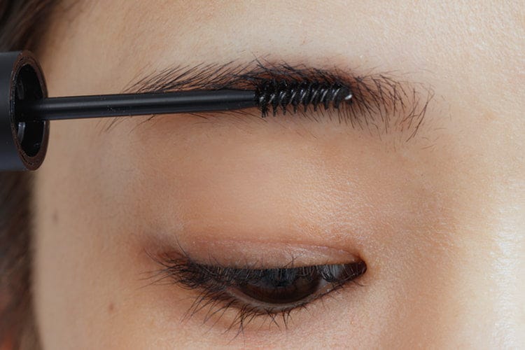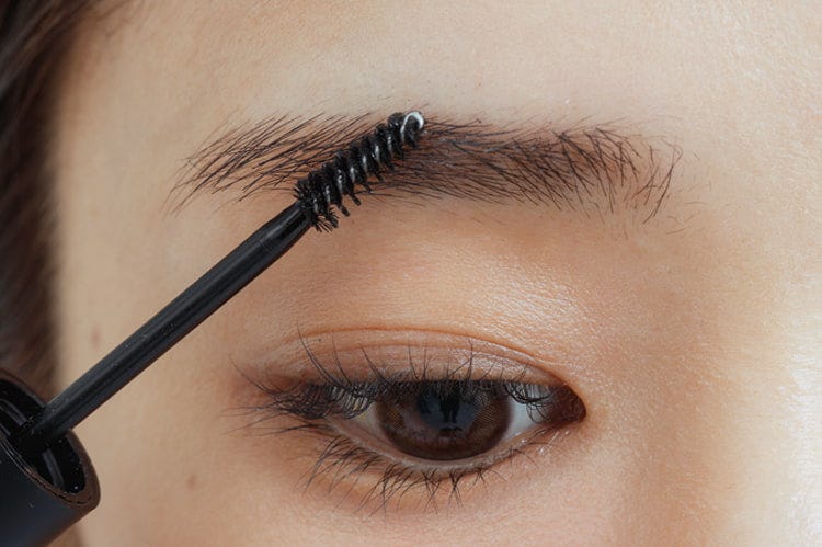 眉マスカラを塗ったあと、そのブラシで眉毛を根元からグッと持ち上げ、上向きの毛並みをフィックス。眉頭も眉尻も上向きの毛流れが今っぽい。