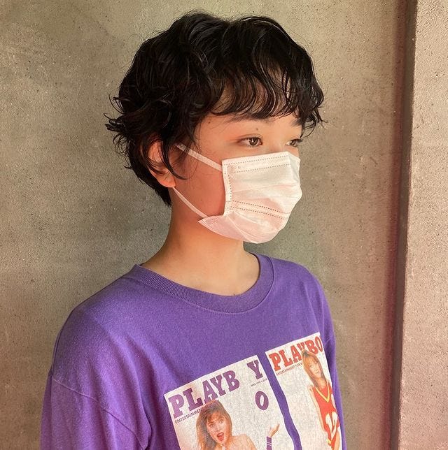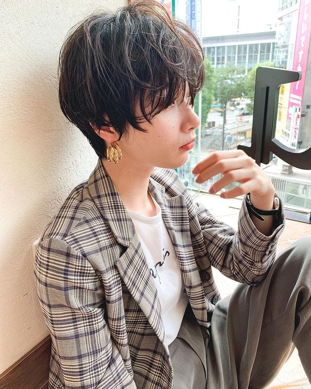 前髪を長く残したハンサムショートに、ニュアンスパーマでゆるめのカールをつけた髪型です。