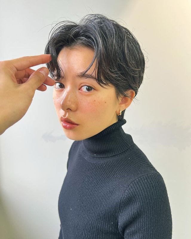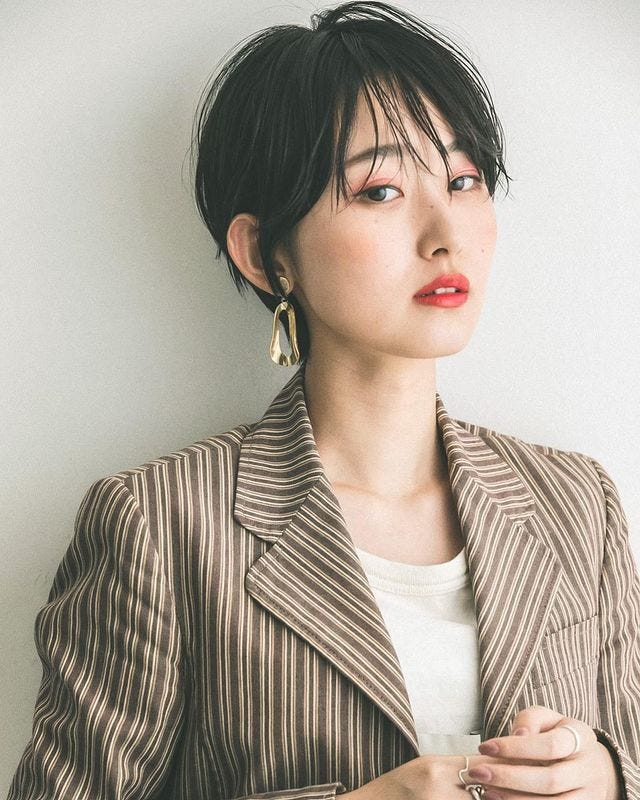 こちらでは細めの束感をつけたスタイリングとツヤを使って、シンプルなショートにトレンドの雰囲気をプラスしていますよ。