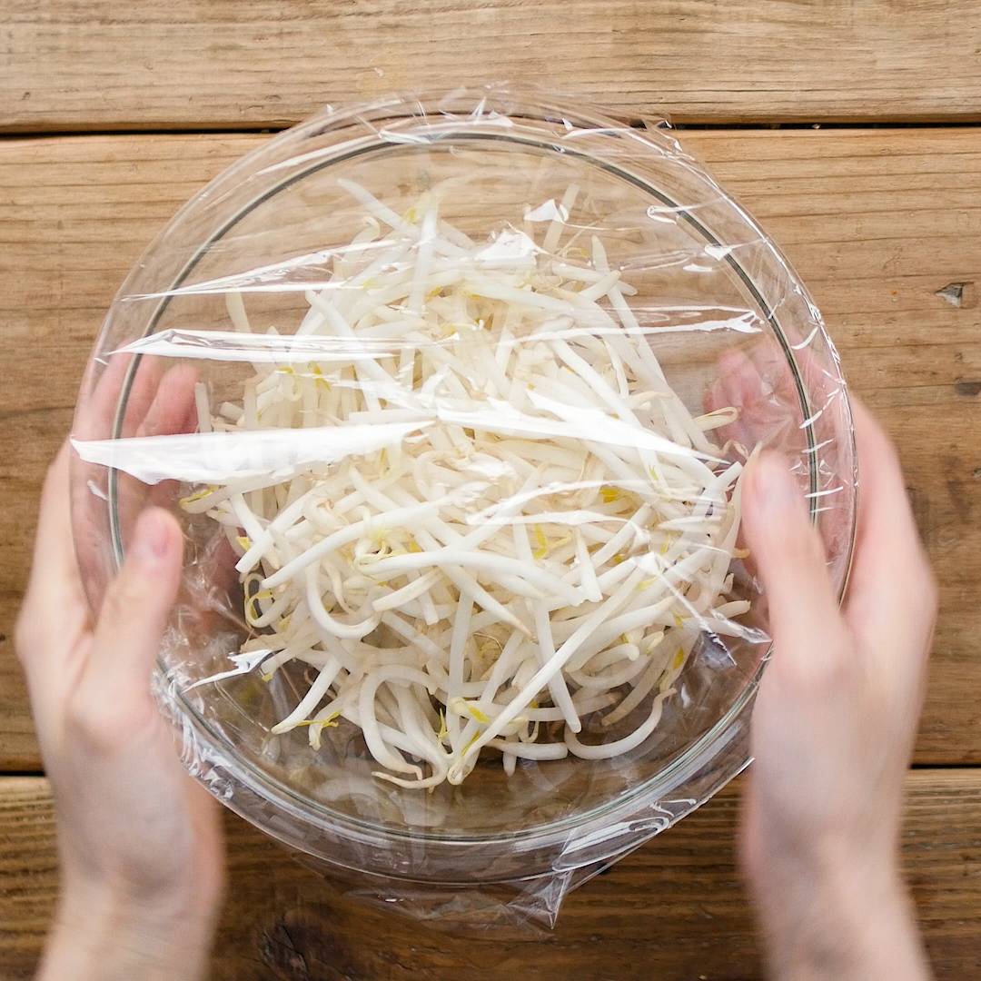 ボウルにもやしを入れてラップをし、レンジ600Wで1分加熱します。