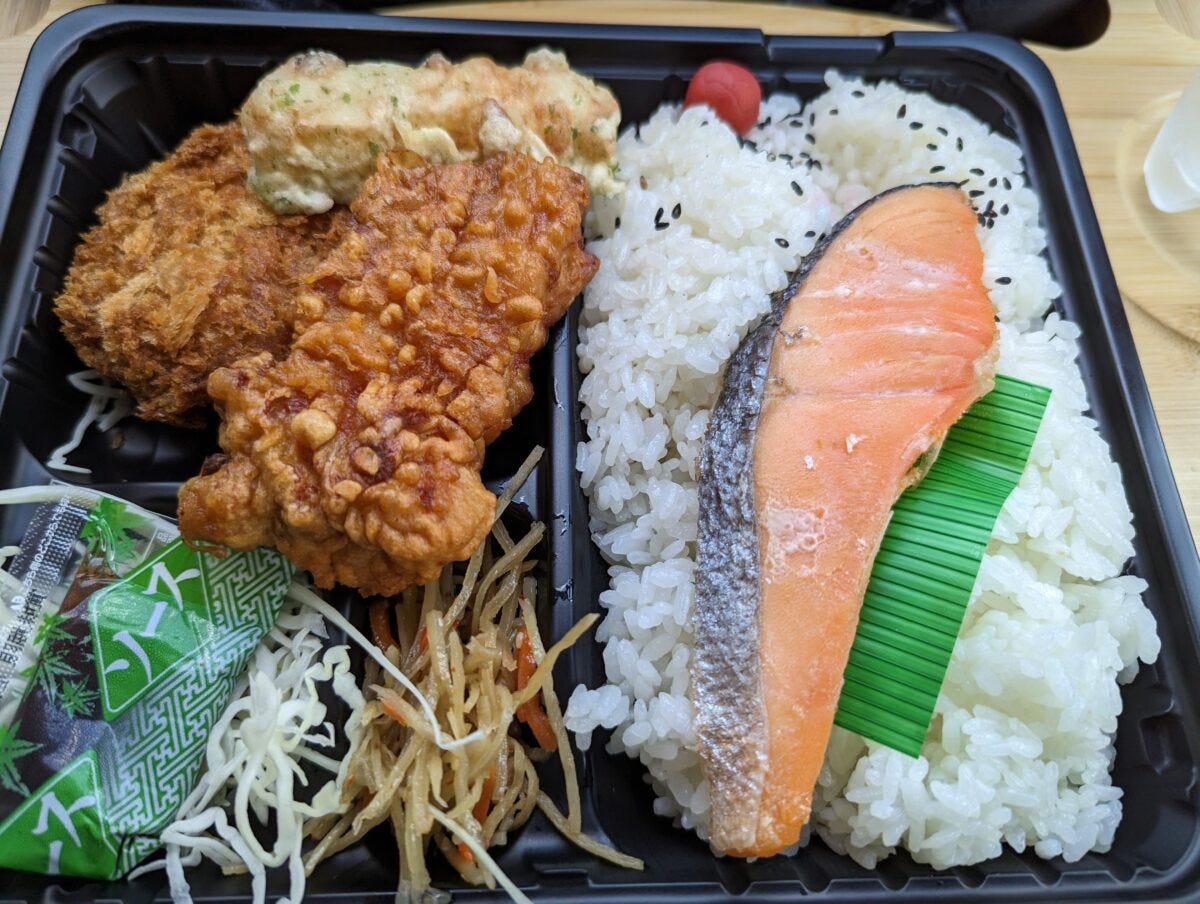 鮭やからあげ以外にもきんぴらごぼうやちくわ天などの具材がたっぷり入っており、とても美味しそうだ。