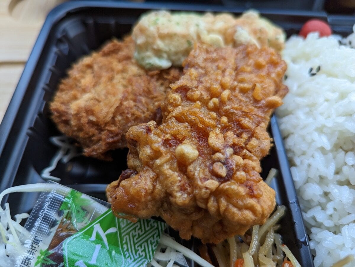 からあげは大判で1つで通常の2個分ぐらいはありそうな量。とてもジューシーに揚がっており味付けもご飯が進むもので、これだけ食べたい! という人はからあげ弁当を選ぶのもあり。