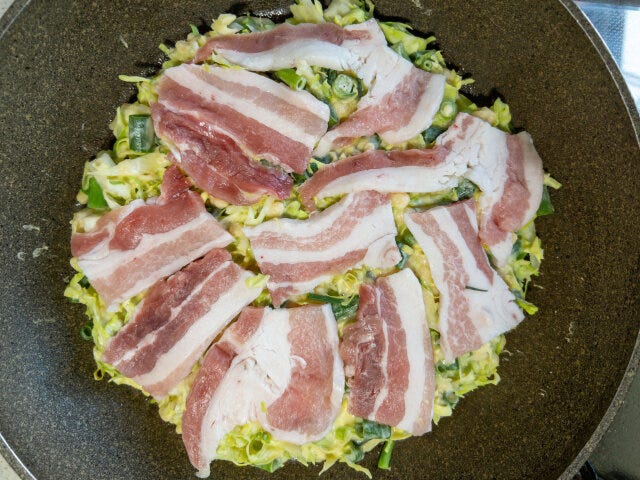 ④ 熱したフライパンにサラダ油を敷いて、③を流し入れて素早く広げ、その上に①の豚バラ薄切り肉を広げて乗せ、弱めの中火で焼き色が付くまで焼き付け、裏返してもう片面も焼き色が付いて、中に火が通るまで焼きます。