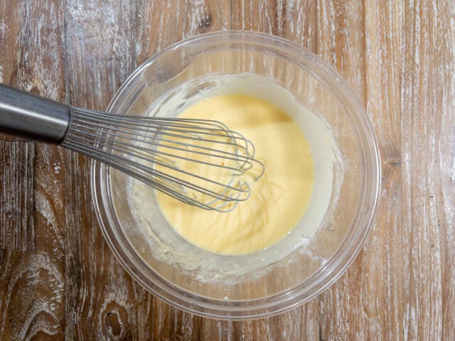 ② ボウルに卵を割り入れ、出汁を加えてホイッパーで混ぜ合わせ、さらに米粉を加えて混ぜ合わせます。米粉はダマになりにくいので、一気に加えて混ぜても大丈夫です。