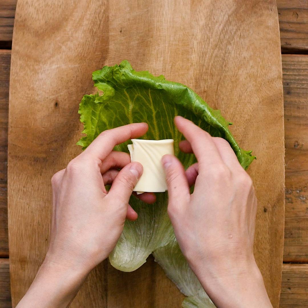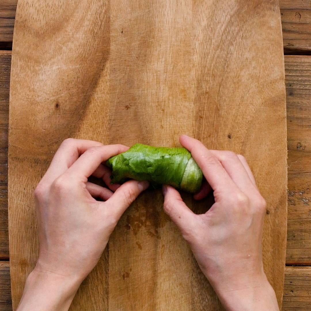 レタス1枚の左右を折りたたみ、端からくるくるときつめに巻いてぎゅっと形を整えます。