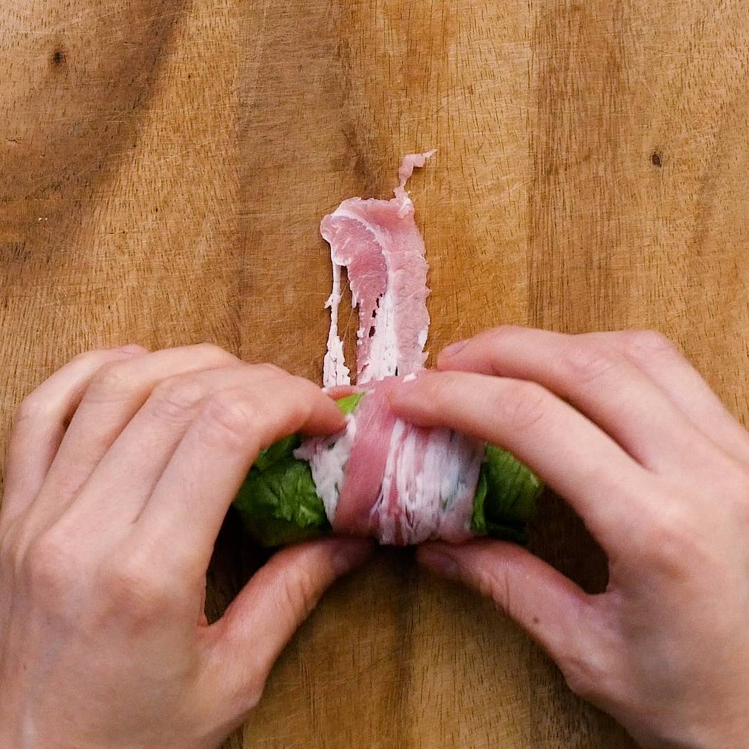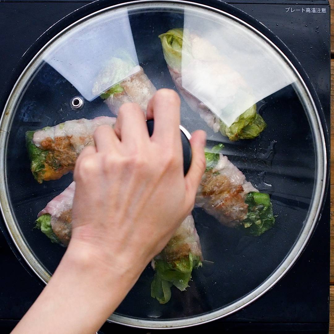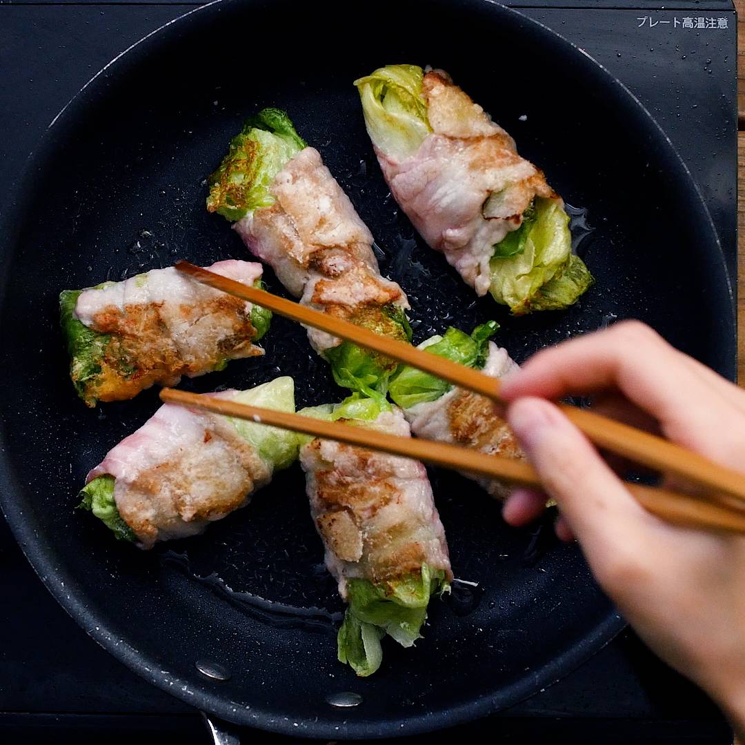 豚バラ肉1枚にレタスを置き、端から巻き上げます。