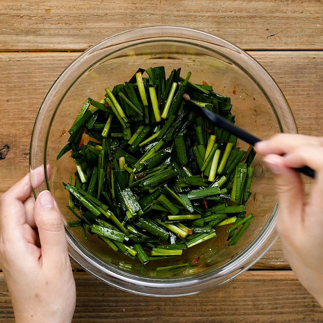 コツ・ポイント ニラは洗ったらしっかり水けを拭き取ってください。