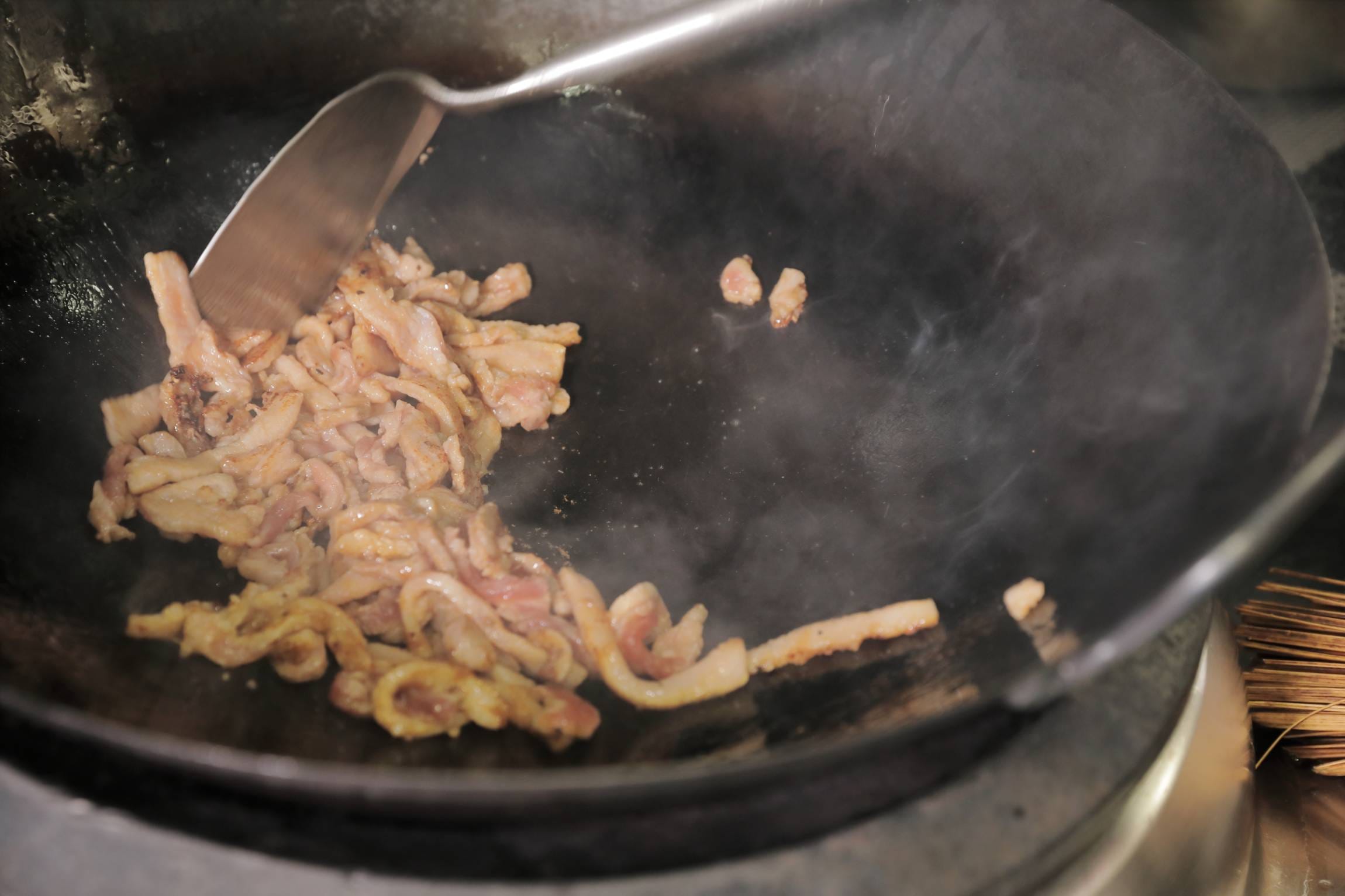 しょうがとにんにくの香りが立ってきたら、豚バラ肉を加えます。肉に少し焦げ目を付けるようにしながら、中火で炒めます。