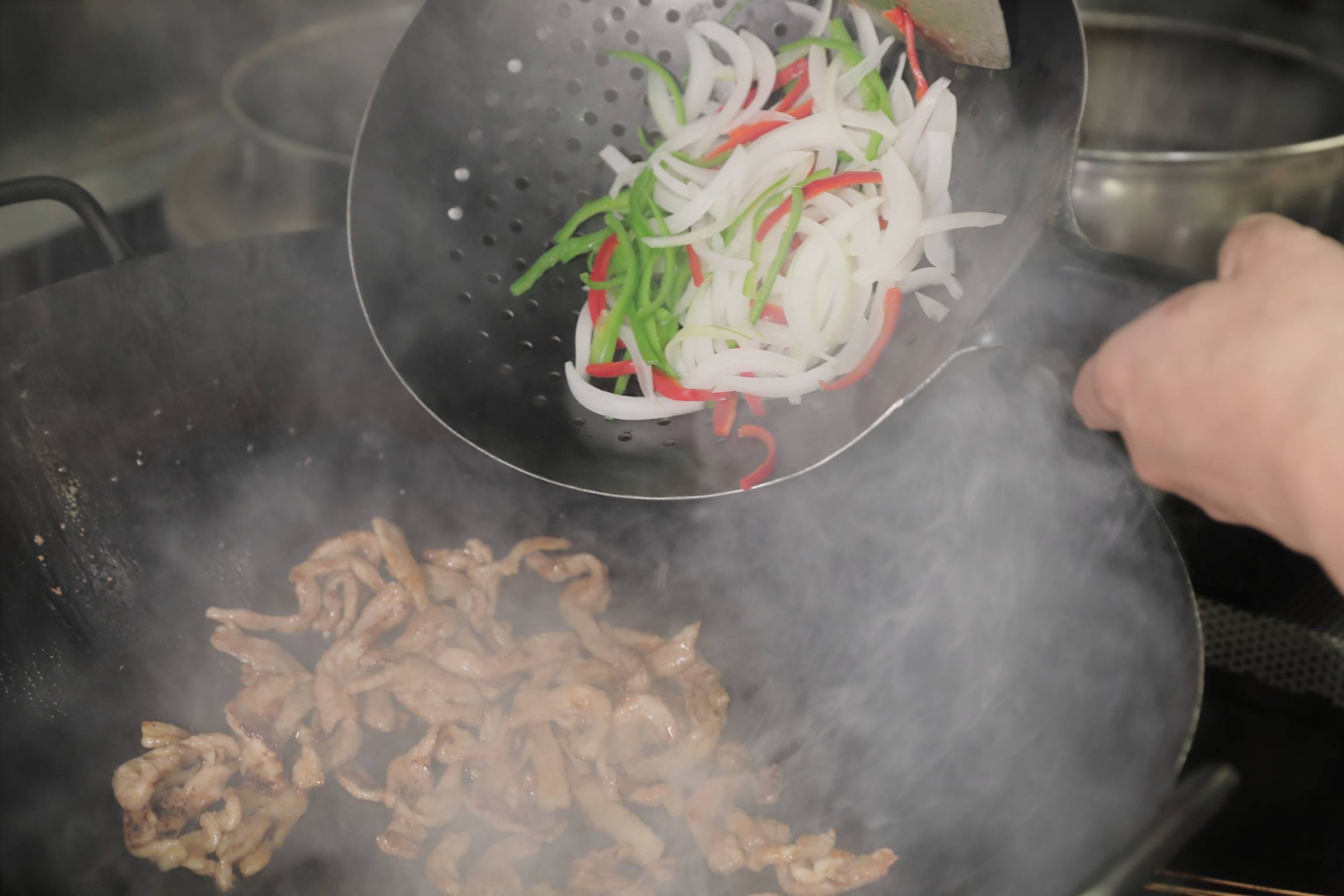 肉に火が通ったら、下ゆでしたパプリカ、ピーマン、玉ねぎを加えます。野菜全体に油を回すようにして、さっと炒め合わせます。