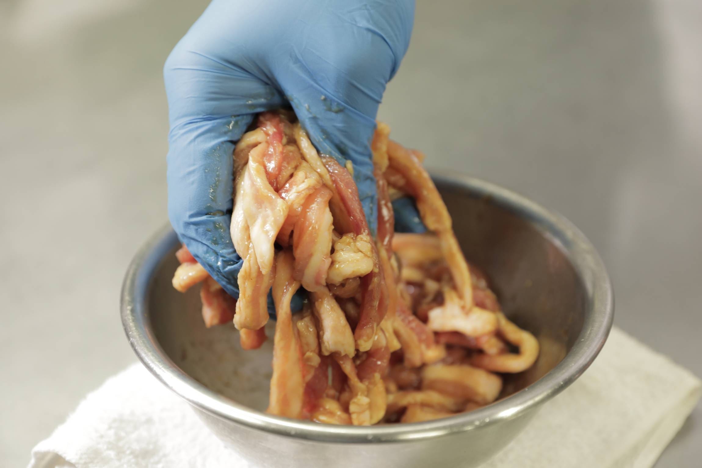 下味の段階で肉に卵と片栗粉を絡めておくと、炒めたときに肉が固くならず、ふわっとやわかな食感に仕上がります。また、下味をつけた肉を多めに仕込んで冷凍しておくと、いろいろな料理に使えて便利です。焦げ目を付けるように肉を炒める