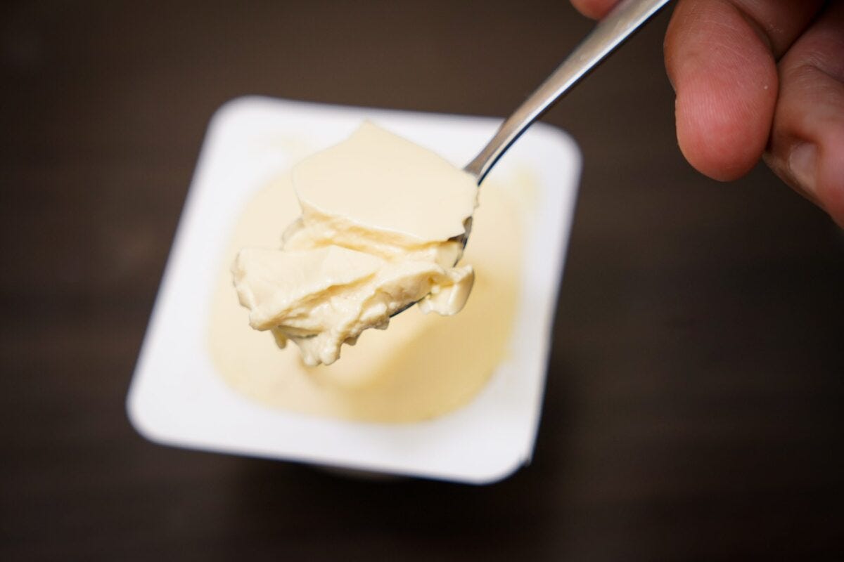 開封するとこのような感じで、見た目は完全に豆腐だ。スプーンですくってみたところ、プリン特有の弾性というよりは、豆腐のほろっ、ぼろっという感触に近い。