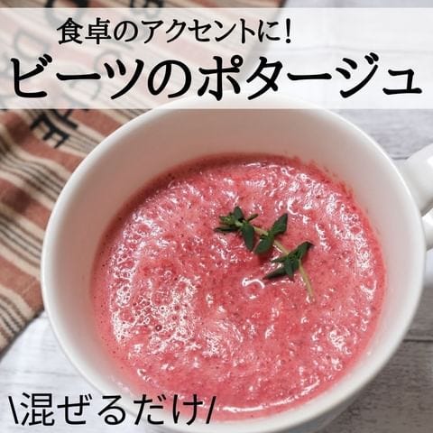 夏と冬に二度旬を迎えるビーツを使った、色鮮やかなポタージュスープです。ビーツといえば、何といってもピンク色が映える点が人気ですよね。