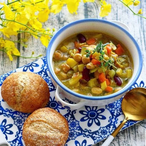 夏野菜のズッキーニやナスのほか、じゃがいもやにんじんにミックスビーンズを合わせた具沢山スープレシピです。