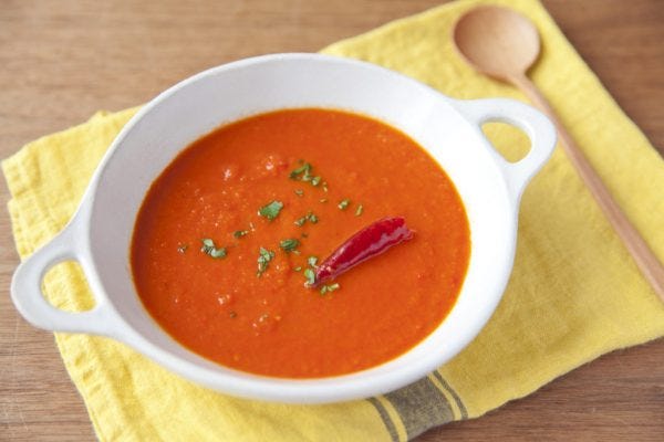 牛乳ではなくトマトジュースで伸ばすことで、野菜の旨味がギュッと詰まったスープが出来上がりますよ。味わいも牛乳に比べてさっぱりとしていて、暑い夏にぴったり。赤唐辛子を入れるので、ピリ辛に仕上がる点も夏におすすめのポイントです。