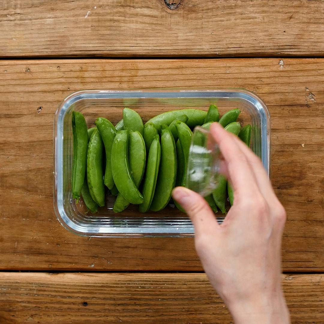 スナップえんどうを耐熱容器に入れ、水(小さじ1杯)を入れてふんわりラップをかけ、レンジ600Wで1分30秒〜2分加熱します。