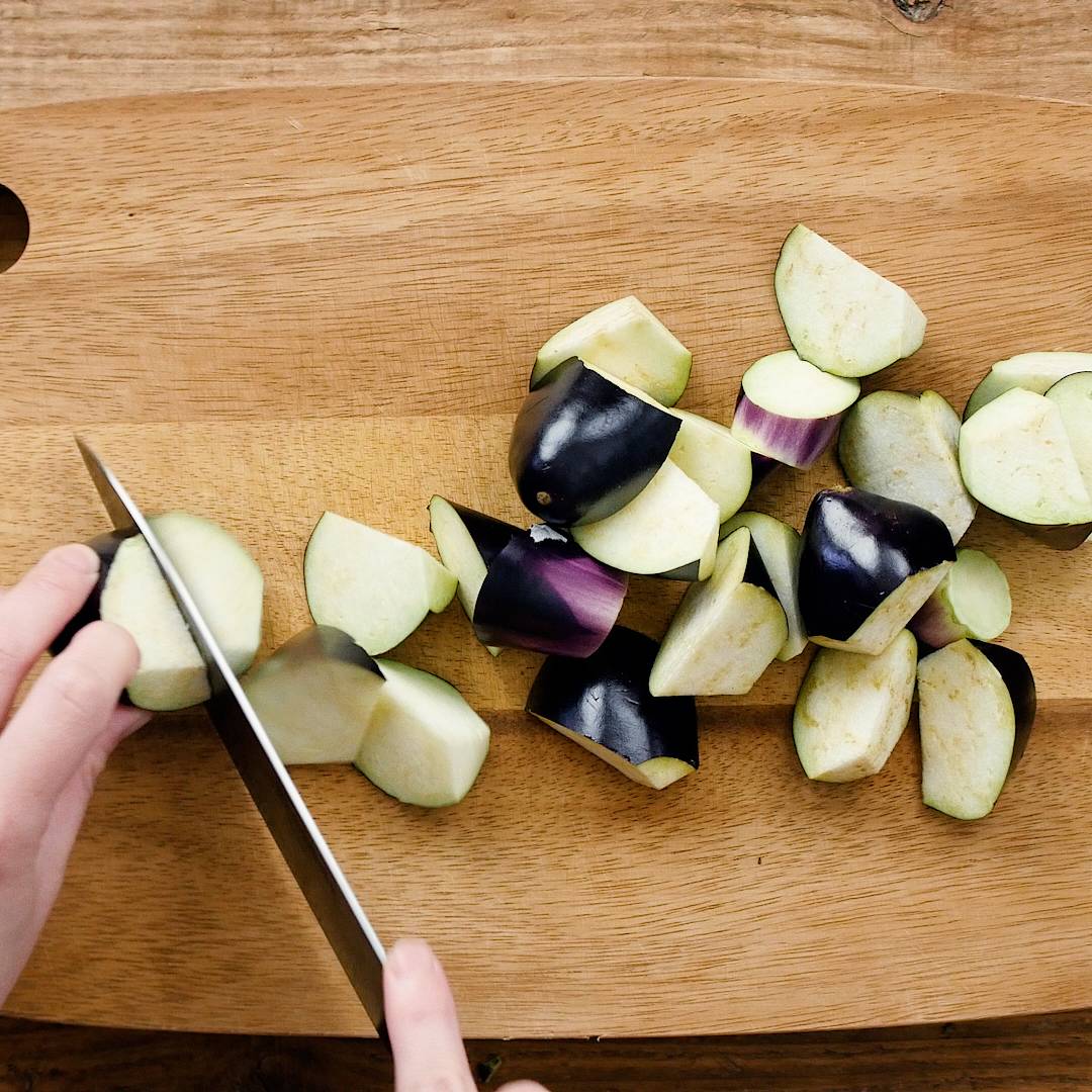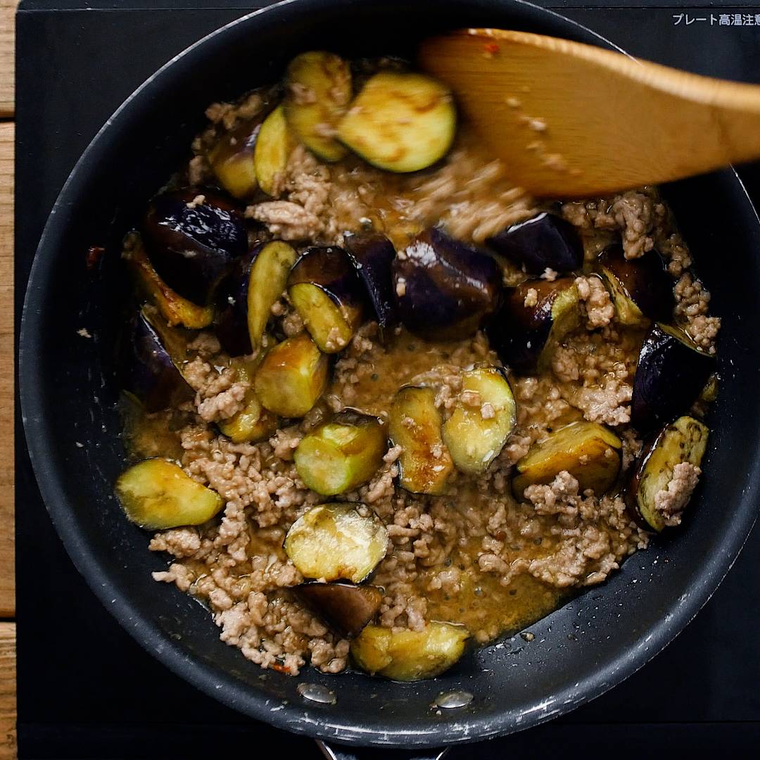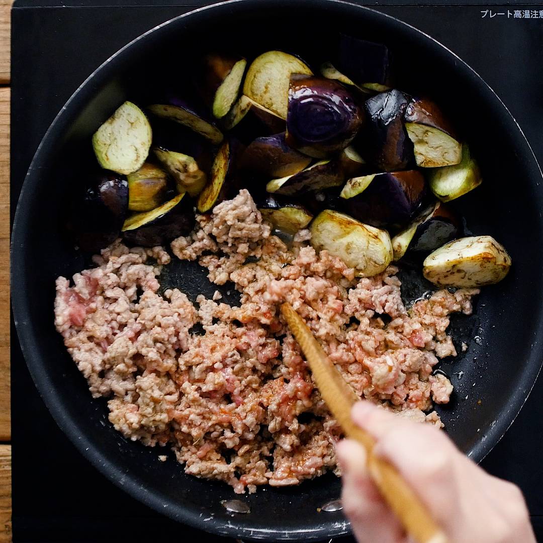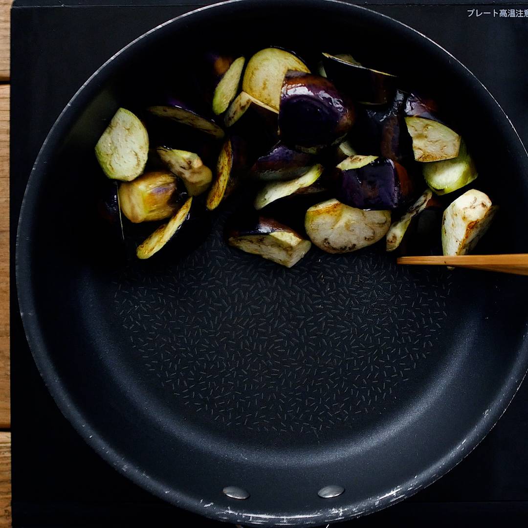 フライパンにサラダ油を引き中火で熱し、なすを炒めます。