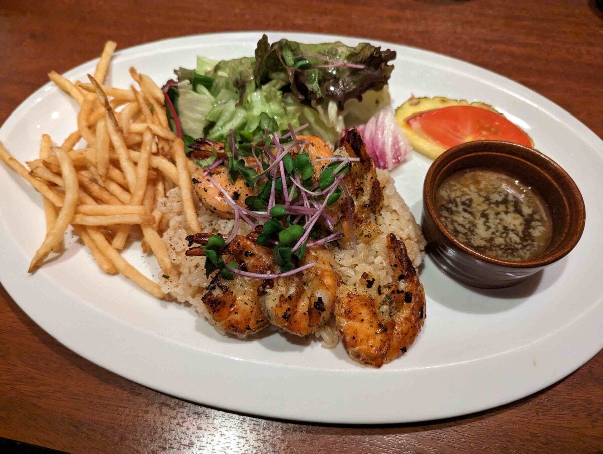料理はどれもバツグンに美味しいものの、値段は意外とリーズナブル。こちらの「ガーリックシュリンプ&ピラフ 醤油バターソース」は、ガーリックシュリンプが6尾にピラフ、フライドポテトにサラダ、フルーツがついて税抜1,580円。大皿に盛られかなりの量があるのにこの価格は嬉しい。