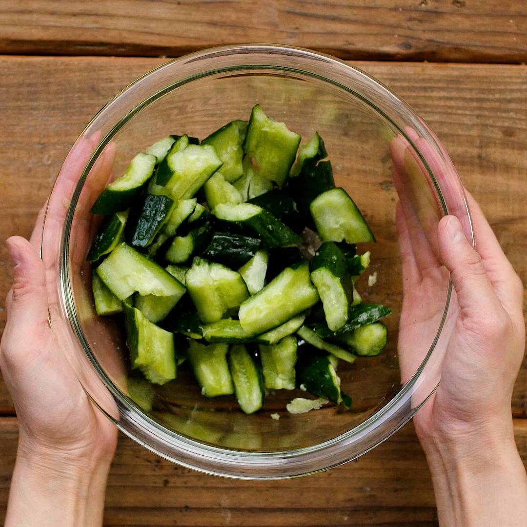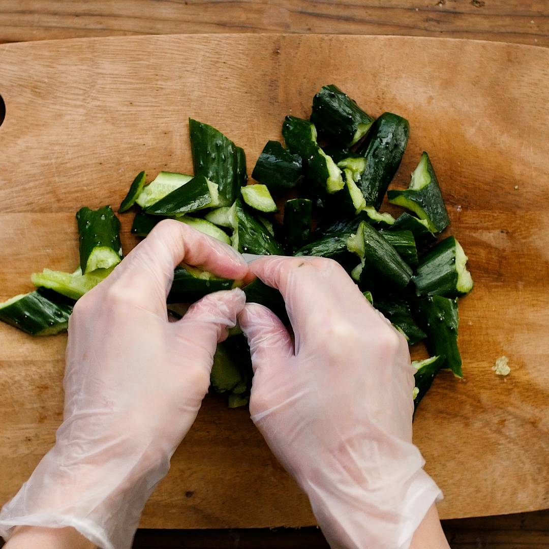 きゅうりを両手で上からおさえつけて、割れ目から手でさくことにより、包丁で切った時よりもきゅうりの断面がガタガタになります。そうすることで表面積が広くなり、包丁で切った時よりも調味料が染み込みやすくなりますよ。