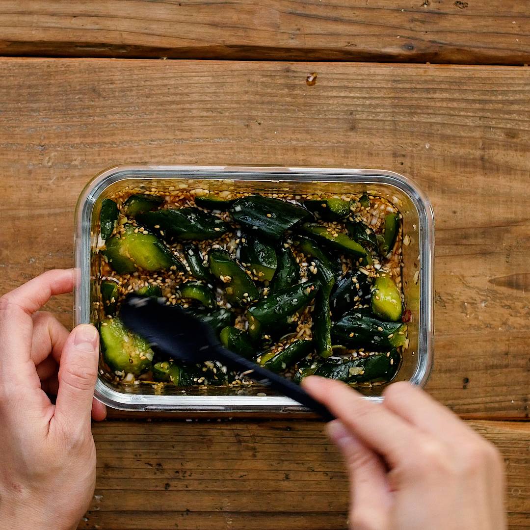 耐熱容器に長ねぎと (a) を入れてよく混ぜます。きゅうり、輪切り唐辛子、白いりごまを加えてさらに混ぜ合わせます。