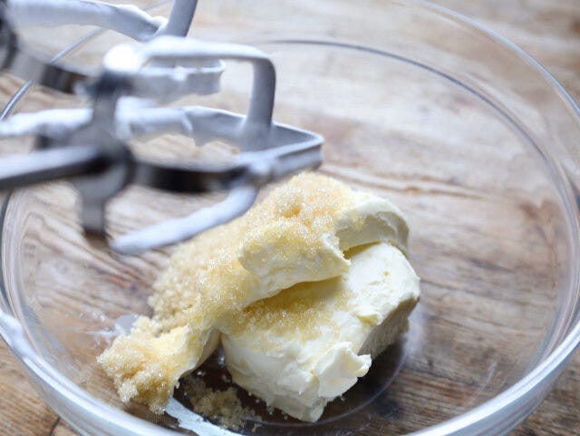 ② 別のボウルにクリームチーズと砂糖を入れ、そのままのハンドミキサーで、滑らかになるまで混ぜる。