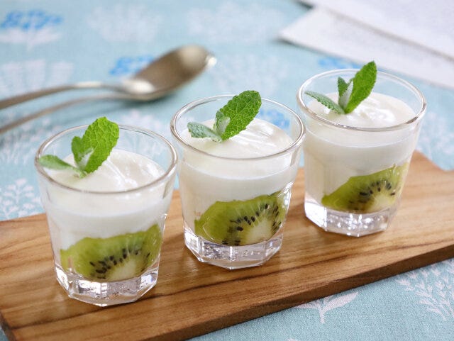 ① グラスまたは器に、輪切りまたは半月切りにしたキウイを入れたら、チーズクリームを入れる。