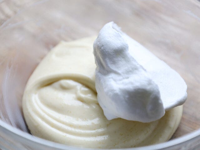 (混ぜる時は、ゴムベラで下からすくって、上から切るイメージで混ぜ合わせます。)