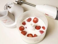 フードプロセッサーやブレンダーに、凍らせたいちご、ヨーグルト、牛乳、ガムシロップを入れ、スイッチオン!