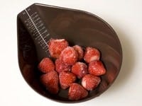 いちごのヘタをとり、袋に平らに入れ、冷凍庫で約2時間、凍らせます。
