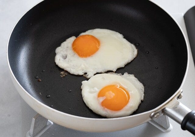 ② フライパンにサラダ油小さじ1を入れて中火にかけ、卵を入れて目玉焼きを作る。蓋をせずに焼き、卵黄が半熟の状態になったら取り出す。
