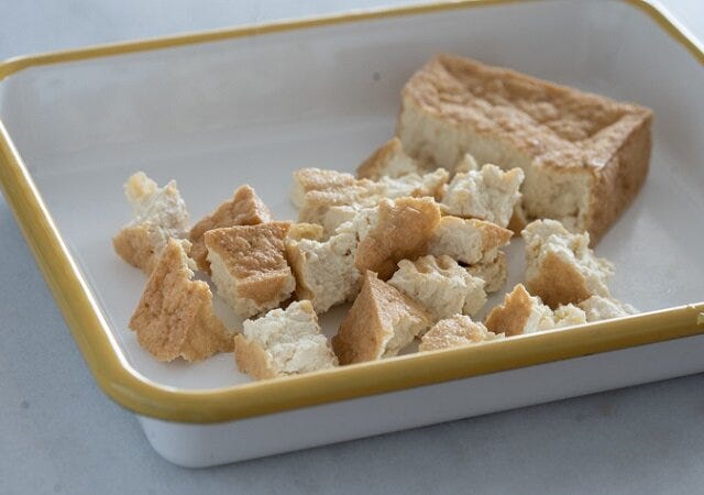 厚揚げは、キッチンペーパーなどで油をおさえ、手で1~2cmの大きさにちぎる。
