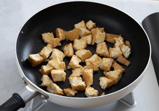 ③ フライパンをキッチンペーパーなどで軽くふき、サラダ油小さじ1を加えて、中火で厚揚げを炒める。香ばしい焼き色がついたら取り出す。