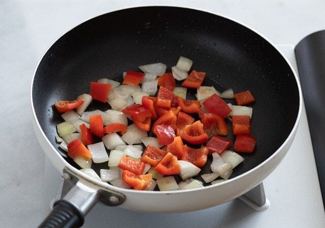 ④ フライパンに残りのサラダ油小さじ1を入れて、中火で玉ねぎを炒める。玉ねぎが透き通ってきたら、パプリカを入れて炒める。