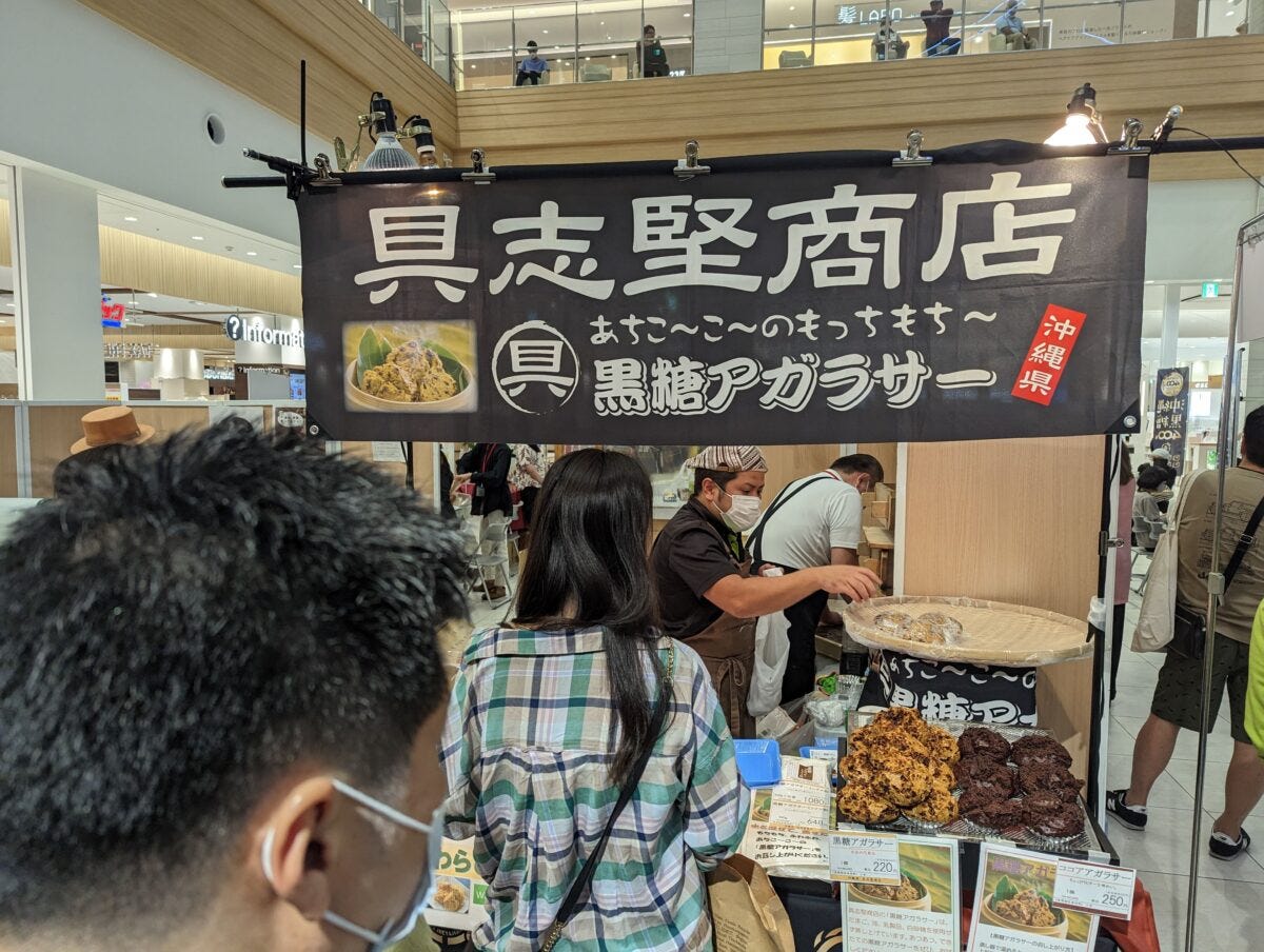 宜野湾のパルコで開催されていた、黒糖の日を記念するイベントで提供されていたアガラサー、記者も意を決して行列に並び、購入することに。