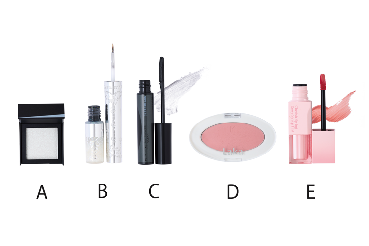 Dを大きめのブラシにとり、ほおの中央から左右に往復してふんわり広範囲につける。Eを唇全体につけボリューミィなリップに仕上げる。ラメラメなアイメイクとバランスをとるように、リップとチークはシンプルに。