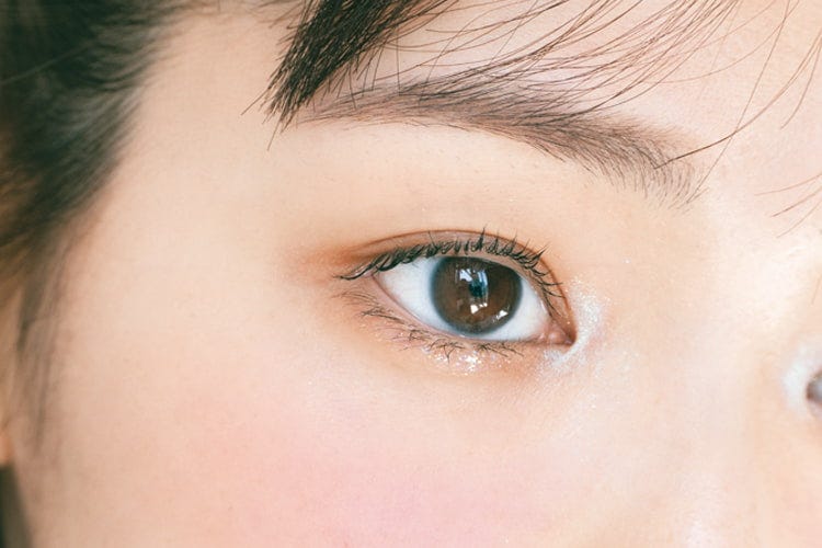 まぶたの自然なくすみを生かし、ノーシャドウに。目頭の切れ込みを起点に、Aをくの字に入れる。Bを目のきわ、黒目幅にランダムにトントンと点在させるようにつける。Cを上下まつ毛に軽く1度塗りしてツヤをオン。