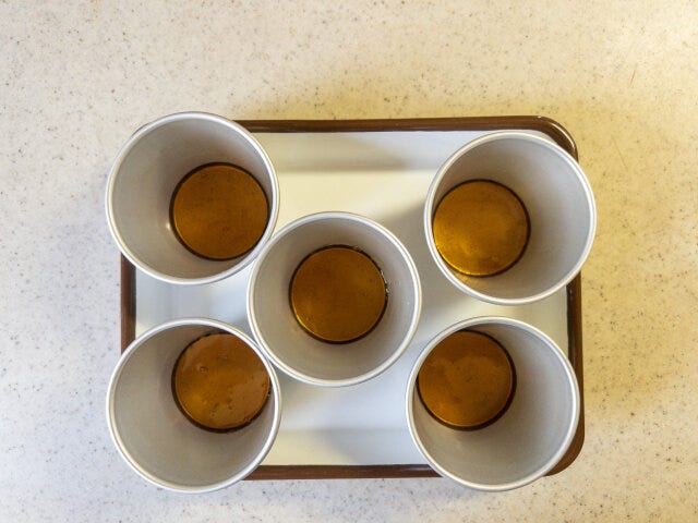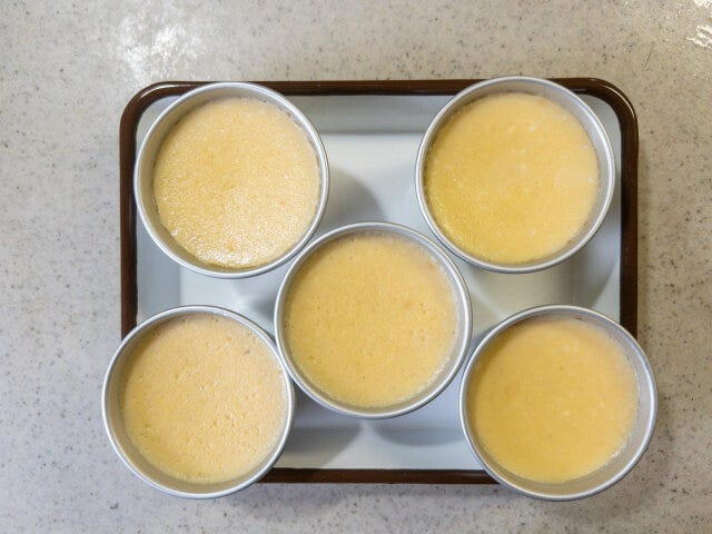 濡らしたプリン型に、カラメルソースを5等分にして流し入れ、冷蔵庫で冷やしておきます。