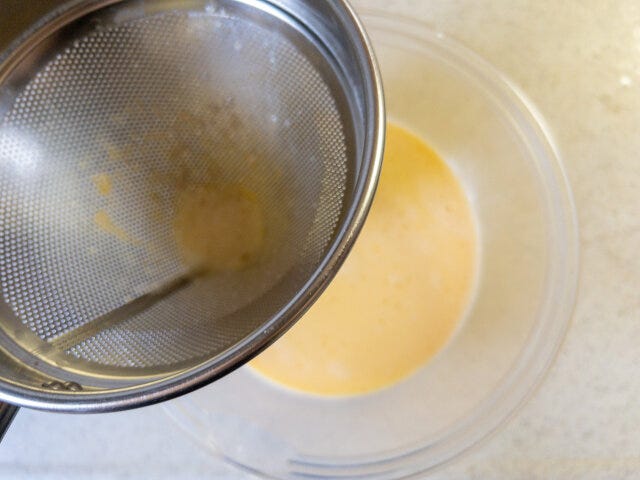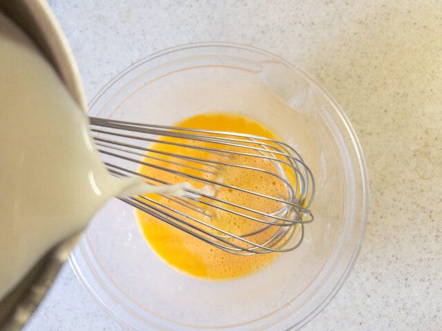 ③ 卵をボウルに割り入れ、泡立てないように滑らかにほぐし、②の牛乳を加えて混ぜます。