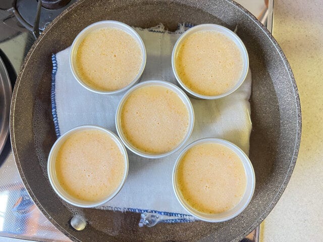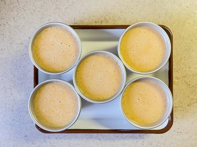 ⑤ ①のプリン型に九分目くらいまで、④のプリン液を流し入れます。(1個約120ml)