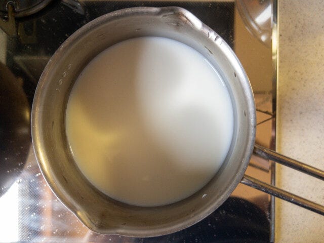 ② 小鍋に牛乳と砂糖を入れて火にかけ、温めながら煮溶かします。