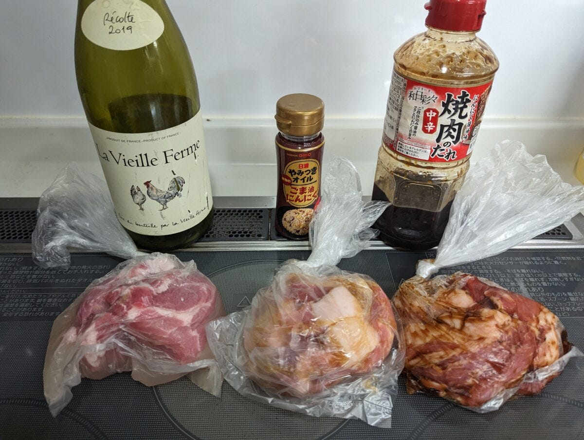 用意したのは、白ワインのほかに、定番の「焼肉のたれ」、流行りの「にんにくごま油」の2種。肉を柔らかくする効果としては油はそこまでではなさそうだが、香りづけに適していそうなこと、焼肉のたれは果実も入っているので、ワイン級にありそうと期待。それぞれ1晩漬けて、比較した結果は以下のとおりだ。