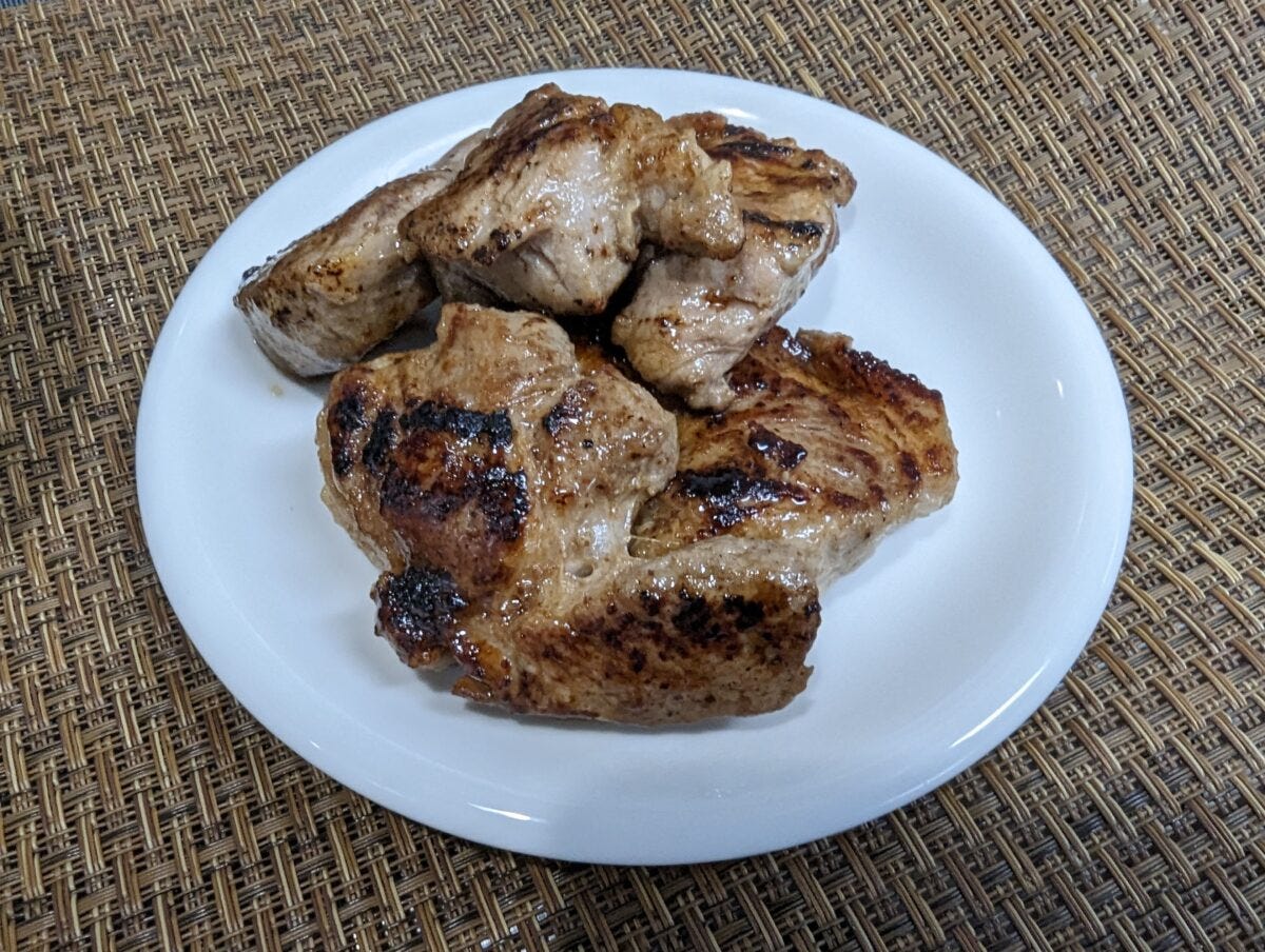 次はにんにくごま油。柔らかさはワインほどではないが、意外にもそのままと比べるとしっとり柔らかくなっている。香りもごま油とにんにくが肉と相性が良い。